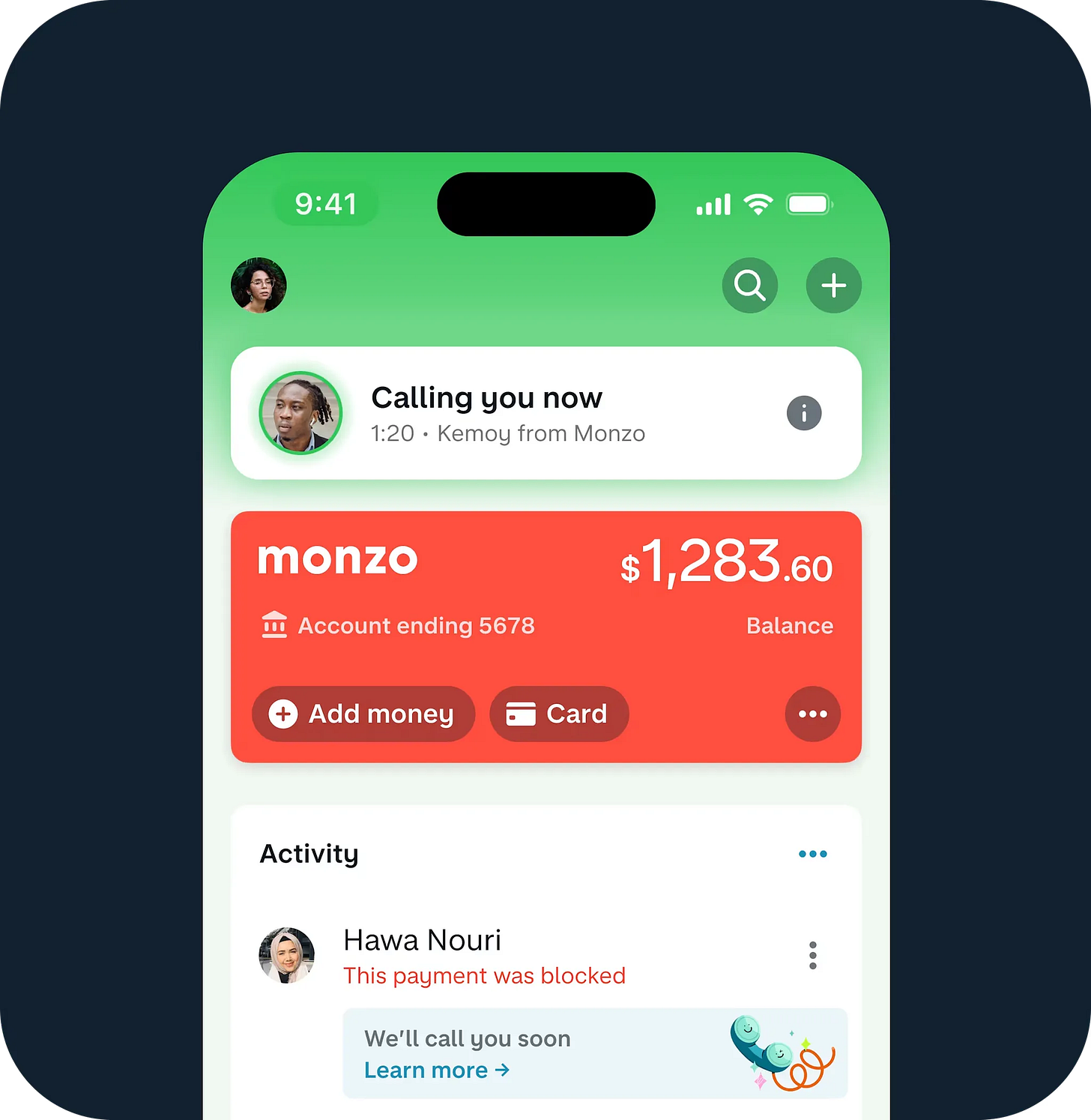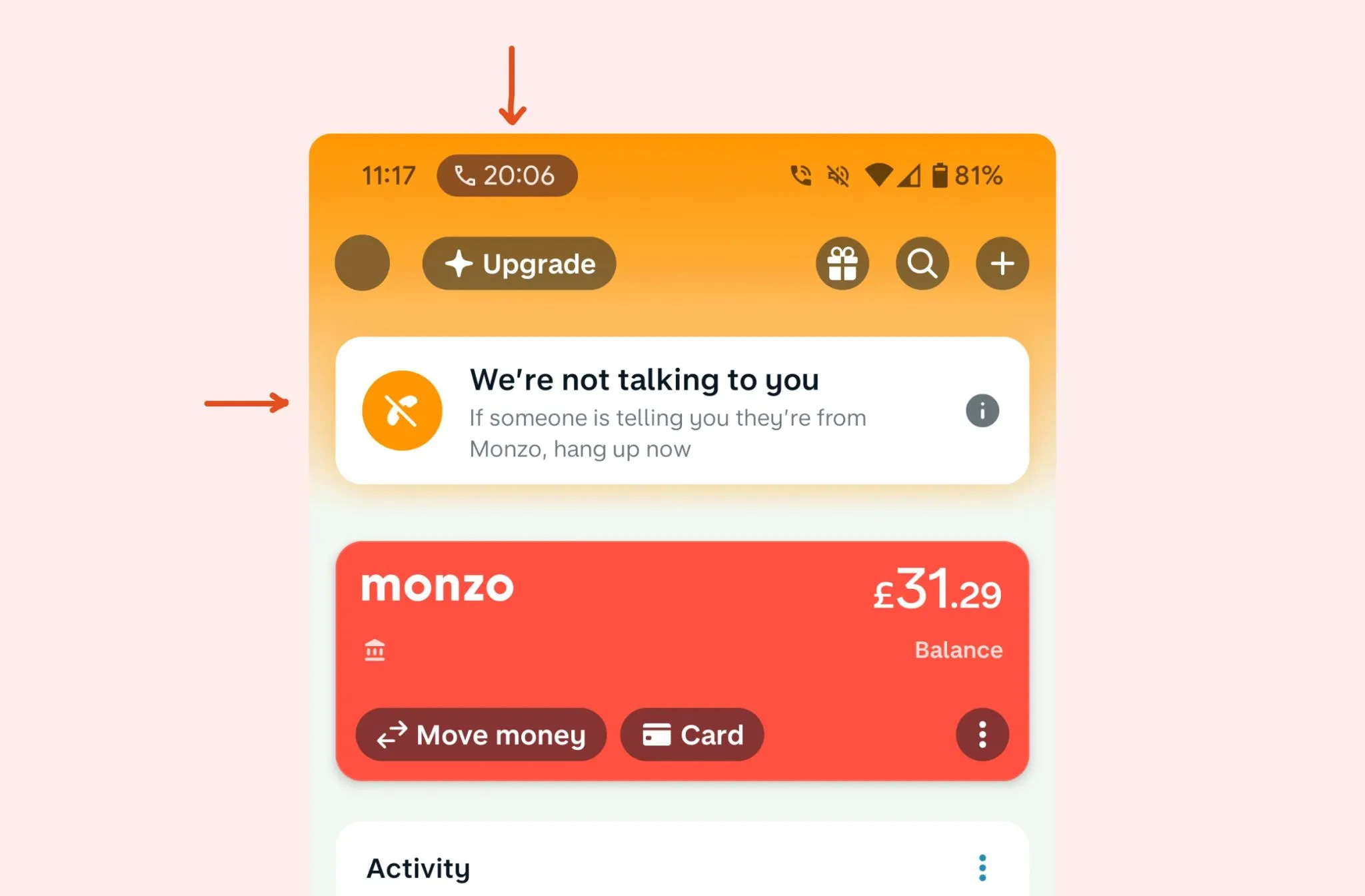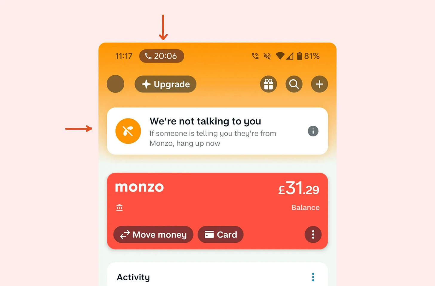 Monzo’s fraud protection message - If you are on a call and open the Monzo app, you can check if it’s a legitimate call from Monzo. It's so simple and effective in preventing phishing calls.