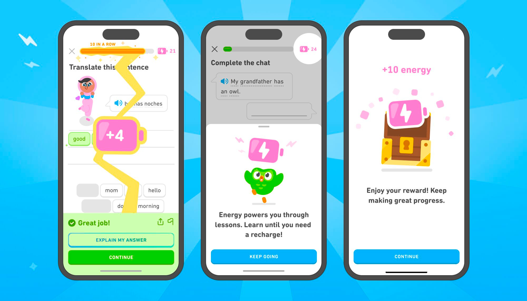 According to Duolingo, delight is the difference between a product you use and a product you love. That’s why every interaction in the app is designed with delight in mind. Duolingo’s owl, humor, and playful nudges turn the boring task of learning a language into fun. Recently, they made a notable product update, introducing energy signs to indicate progress, a form of positive reinforcement.