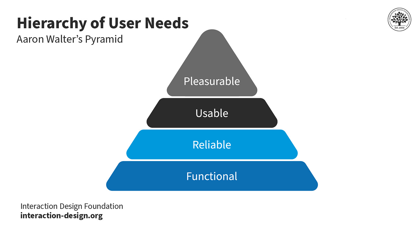 Similar to Maslow’s hierarchy of human needs, UX expert Aaron Walter’s book ‘Designing for Emotions’ introduces the pyramid of user needs that looks like this: