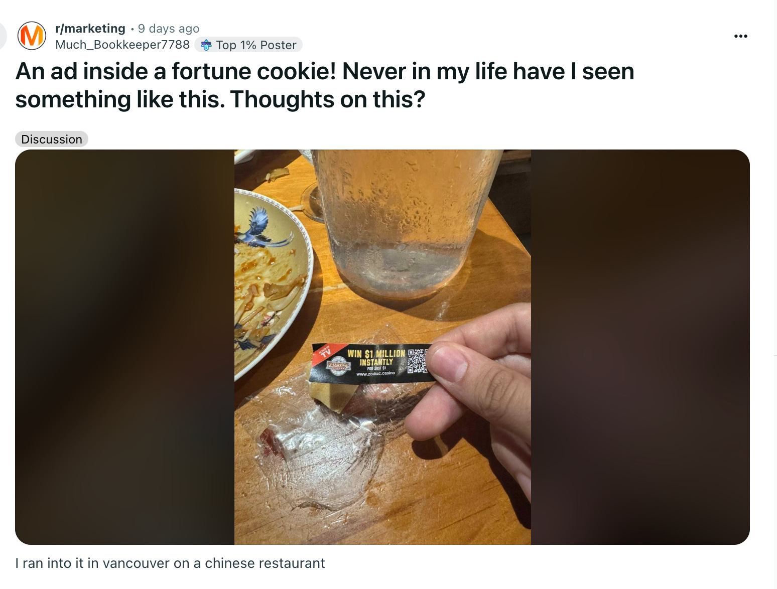 Someone posted on Reddit that they were shocked to find an ad for a lottery ticket inside a fortune cookie.
