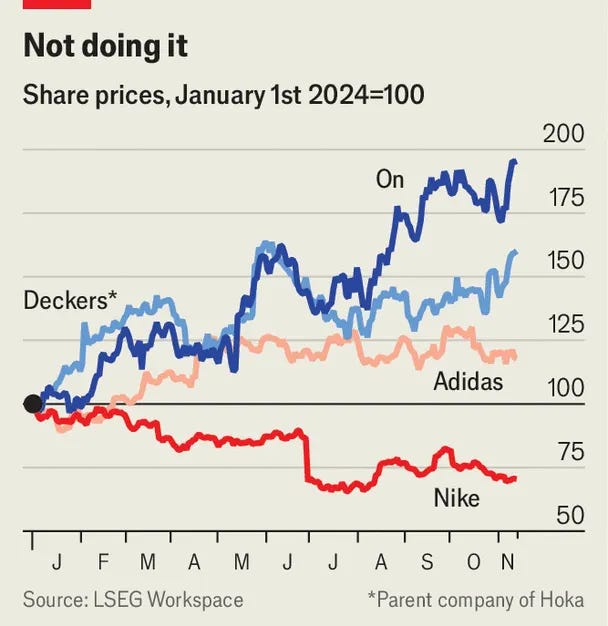 I mainly trained in ON and Asics shoes. I have a couple of Nikes, but I never use them for any serious training. And I notice a similar pattern in the athletic community around me. The market data confirms the trend: