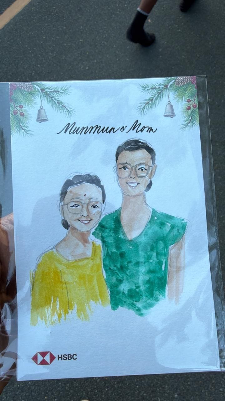 I experienced this at the HSBC booth when a local artist made a quick portrait of my mother and me, and it will stay on my fridge for a while.