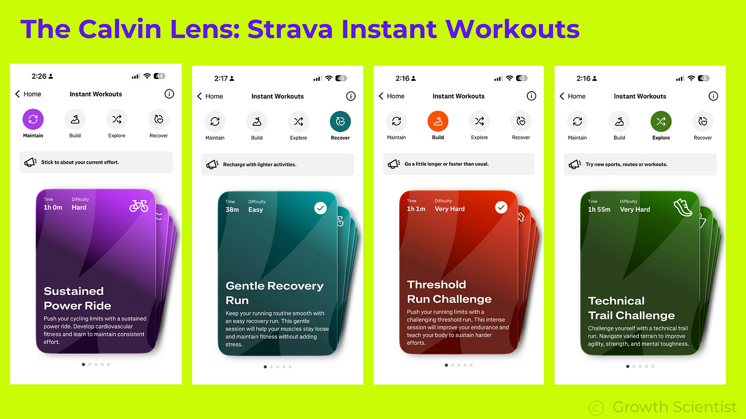 Strava’s primary utility has been to record your activities. Instant Workouts pushes it toward coaching. The functional user need it fulfils is to remove the need for planning for someone who wakes up unsure what to do today. For example, if you’re new to running, this is helpful. You open the app, and you have a clear next step.