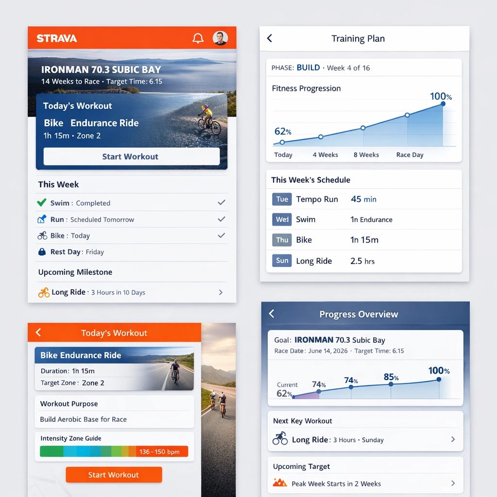 Strava has rich data on my past: pace, fatigue patterns, frequency, and injury signals. That data tells the app what I can handle.